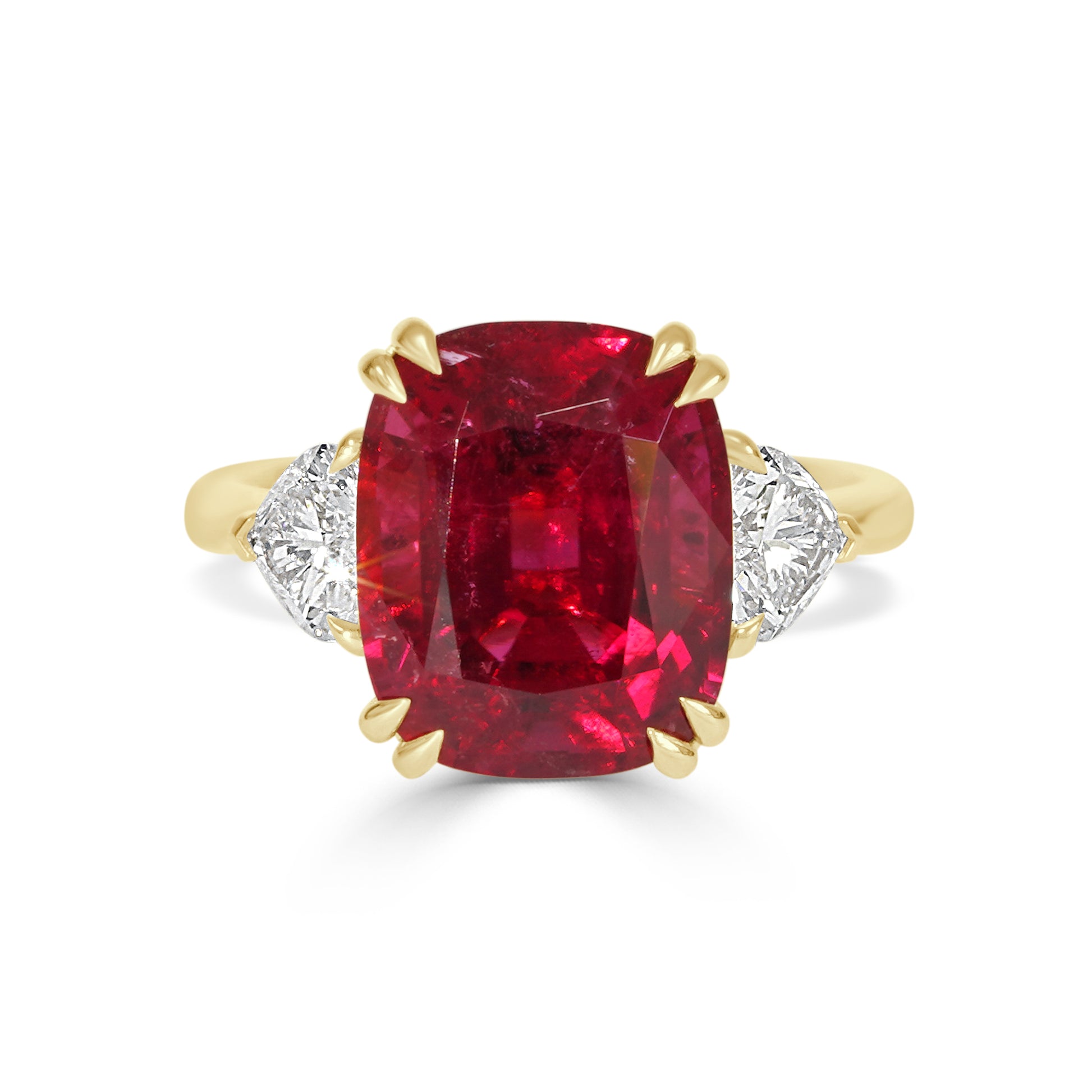 This exquisite trilogy ring presents a harmonious blend of colour and brilliance, featuring a  deep red rubellite as a striking centrepiece, its natural warmth enhanced by the brilliant sparkle of the flanking hearts.  An enduring piece that celebrates both romance and refined taste with grace